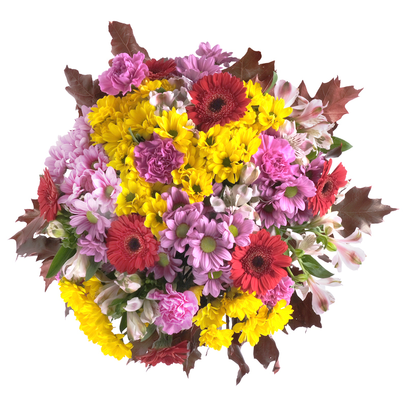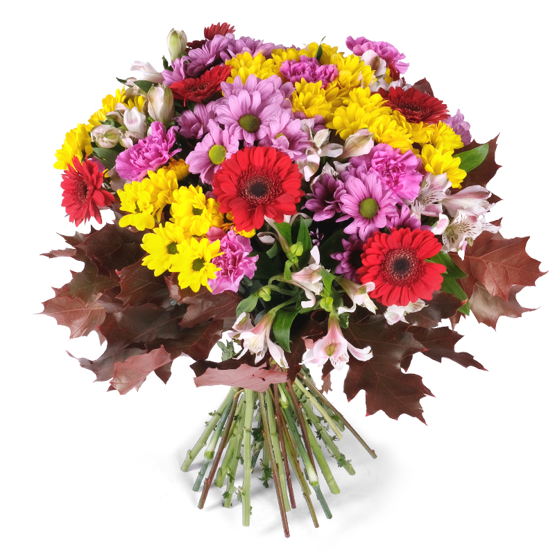 Witalna energia gerber, margerytek i alstromerii sprawia, że kompozycja emanuje siłą i entuzjazmem. To prezent dla osób aktywnych i kochających życie. Ciemne liście jako przybranie dodają kwiatom jesiennego klimatu. Dodaj bilecik i przekaż dużo miłych słów!