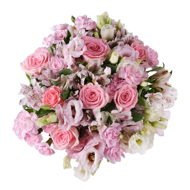 Kompozycja róży, goździka, eustomy i alstromerii w bukiecie „Siła kobiecości” emanuje spokojem, harmonią i siłą. Warto dołączyć bilecik z własnym tekstem.